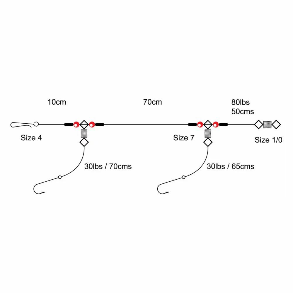 Αρματωσιά για Surf Casting με δύο αγκίστρια. Το ένα παράμαλλο είναι μακρύ και κοντά στο αγκίστρι για να ψάχνει καλύτερα τον βυθό, ενώ το δεύτερο ψηλότερα. Τα αγκίστρια είναι μακρύλαιμα για να στέκονται καλύτερα τα μαλακά δολώματα. Διατίθεται σε 3 μεγέθη No2 – No4 – No6.