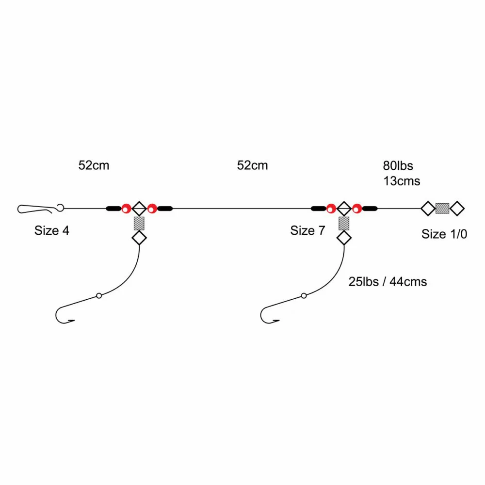 Αρματωσιά για Surf Casting με δύο αγκίστρια. Τα παράμαλλα έχουν μήκος 44 εκατοστά και έχουν τοποθετηθεί αρκετά πάνω από το μολύβι. Αυτό εξυπηρετεί όταν θέλουμε να ψαρέψουμε σε μικτούς βυθούς ή όταν έχει πολύ κύμα. Τα αγκίστρια είναι μακρύλαιμα για να στέκονται καλύτερα τα μαλακά δολώματα. Διατίθεται σε 3 μεγέθη No2 – No4 – No6.